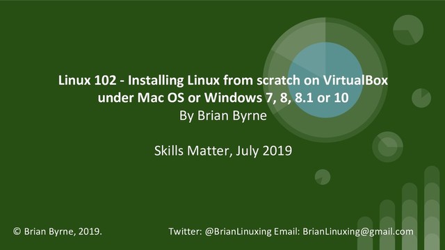 Oracle documentation page: https://www.virtualbox.org/wiki/Documentation Q12: Why not use just Hyper-V, instead of VirtualBox? Hyper-V runs on only Windows systems, these workshops are cross platform and focus on freely available software. Q13: What supported architectures does Debian support? See https://www.debian.org/releases/stretch/i386/ch02s01.html.en Linux 102 by Brian Byrne. Twitter: @BrianLinuxing Email: [email protected]
