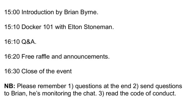 Stoneman. 16:10 Q&A. 16:20 Free raffle and announcements. 16:30 Close of the event NB: Please remember 1) questions at the end 2) send questions to Brian, he’s monitoring the chat. 3) read the code of conduct.