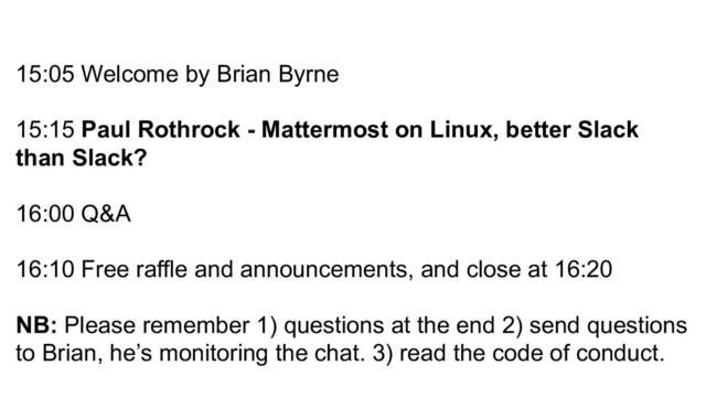 on Linux, better Slack than Slack? 16:00 Q&A 16:10 Free raffle and announcements, and close at 16:20 NB: Please remember 1) questions at the end 2) send questions to Brian, he’s monitoring the chat. 3) read the code of conduct.