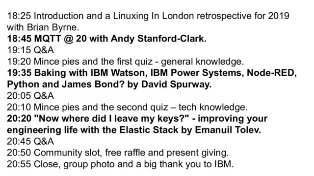 with Brian Byrne. 18:45 MQTT @ 20 with Andy Stanford-Clark. 19:15 Q&A 19:20 Mince pies and the first quiz - general knowledge. 19:35 Baking with IBM Watson, IBM Power Systems, Node-RED, Python and James Bond? by David Spurway. 20:05 Q&A 20:10 Mince pies and the second quiz – tech knowledge. 20:20 "Now where did I leave my keys?" - improving your engineering life with the Elastic Stack by Emanuil Tolev. 20:45 Q&A 20:50 Community slot, free raffle and present giving. 20:55 Close, group photo and a big thank you to IBM.