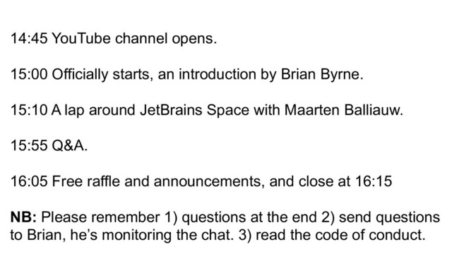 Brian Byrne. 15:10 A lap around JetBrains Space with Maarten Balliauw. 15:55 Q&A. 16:05 Free raffle and announcements, and close at 16:15 NB: Please remember 1) questions at the end 2) send questions to Brian, he’s monitoring the chat. 3) read the code of conduct.