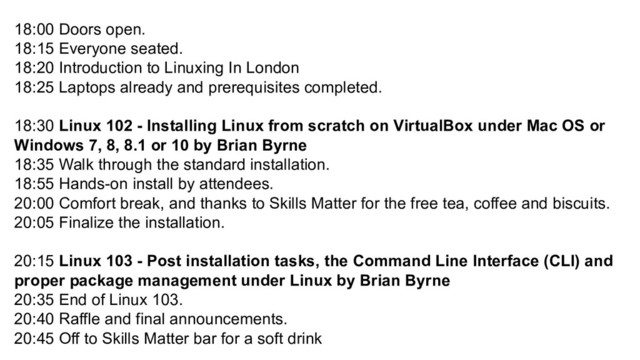 In London 18:25 Laptops already and prerequisites completed. 18:30 Linux 102 - Installing Linux from scratch on VirtualBox under Mac OS or Windows 7, 8, 8.1 or 10 by Brian Byrne 18:35 Walk through the standard installation. 18:55 Hands-on install by attendees. 20:00 Comfort break, and thanks to Skills Matter for the free tea, coffee and biscuits. 20:05 Finalize the installation. 20:15 Linux 103 - Post installation tasks, the Command Line Interface (CLI) and proper package management under Linux by Brian Byrne 20:35 End of Linux 103. 20:40 Raffle and final announcements. 20:45 Off to Skills Matter bar for a soft drink