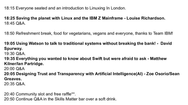 18:25 Saving the planet with Linux and the IBM Z Mainframe - Louise Richardson. 18:45 Q&A. 18:50 Refreshment break, food for vegetarians, vegans and everyone, thanks to Team IBM! 19:05 Using Watson to talk to traditional systems without breaking the bank! - David Spurway. 19:30 Q&A. 19:35 Everything you wanted to know about Swift but were afraid to ask - Matthew Kilner/Ian Partridge. 20:00 Q&A 20:05 Designing Trust and Transparency with Artificial Intelligence(AI) - Zoe Osorio/Sean Greaves. 20:35 Q&A. 20:40 Community slot and free raffle**. 20:50 Continue Q&A in the Skills Matter bar over a soft drink.