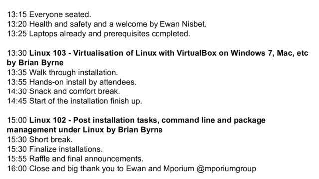 by Ewan Nisbet. 13:25 Laptops already and prerequisites completed. 13:30 Linux 103 - Virtualisation of Linux with VirtualBox on Windows 7, Mac, etc by Brian Byrne 13:35 Walk through installation. 13:55 Hands-on install by attendees. 14:30 Snack and comfort break. 14:45 Start of the installation finish up. 15:00 Linux 102 - Post installation tasks, command line and package management under Linux by Brian Byrne 15:30 Short break. 15:30 Finalize installations. 15:55 Raffle and final announcements. 16:00 Close and big thank you to Ewan and Mporium @mporiumgroup