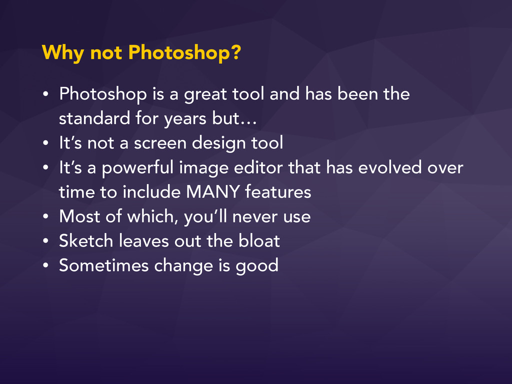 standard for years but… • It’s not a screen design tool • It’s a powerful image editor that has evolved over time to include MANY features • Most of which, you’ll never use • Sketch leaves out the bloat • Sometimes change is good Why not Photoshop?