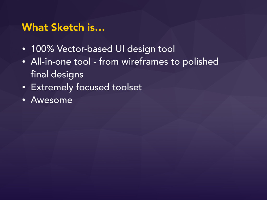 from wireframes to polished final designs • Extremely focused toolset • Awesome What Sketch is…
