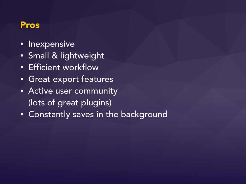 • Great export features • Active user community (lots of great plugins) • Constantly saves in the background