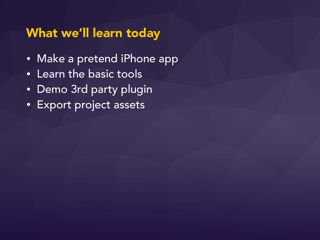 tools • Demo 3rd party plugin • Export project assets What we’ll learn today