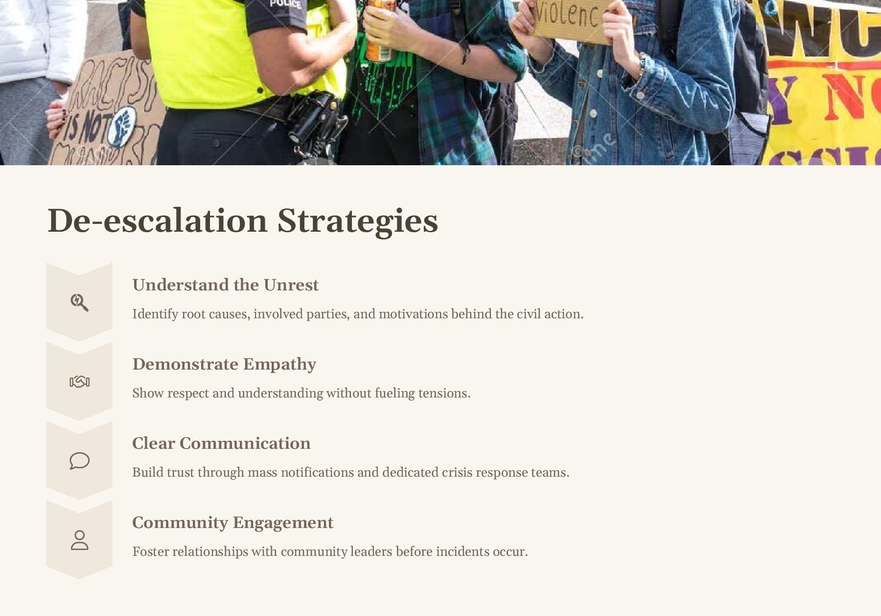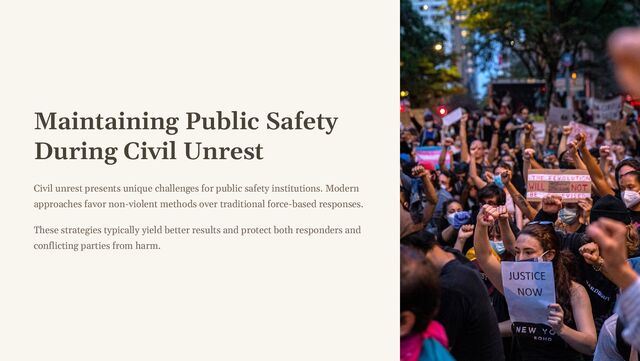 Civil unrest presents unique challenges for public safety institutions. Modern approaches favor non-violent methods over traditional force-based responses.