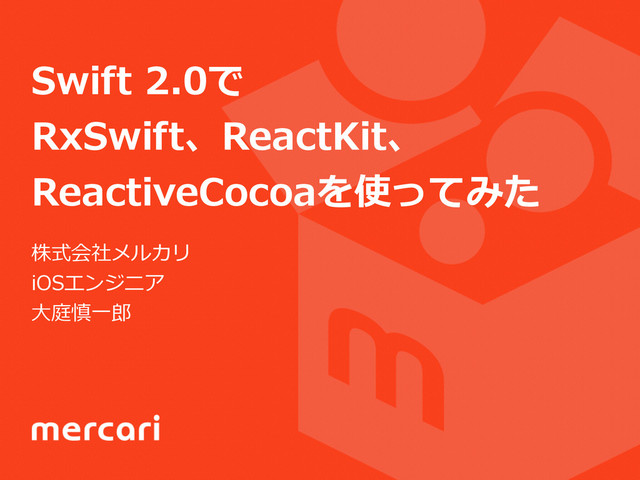 Swift 2.0で RxSwift、ReactKit、 ReactiveCocoaを使ってみた 株式会社メルカリ iOSエンジニア ⼤庭慎⼀郎