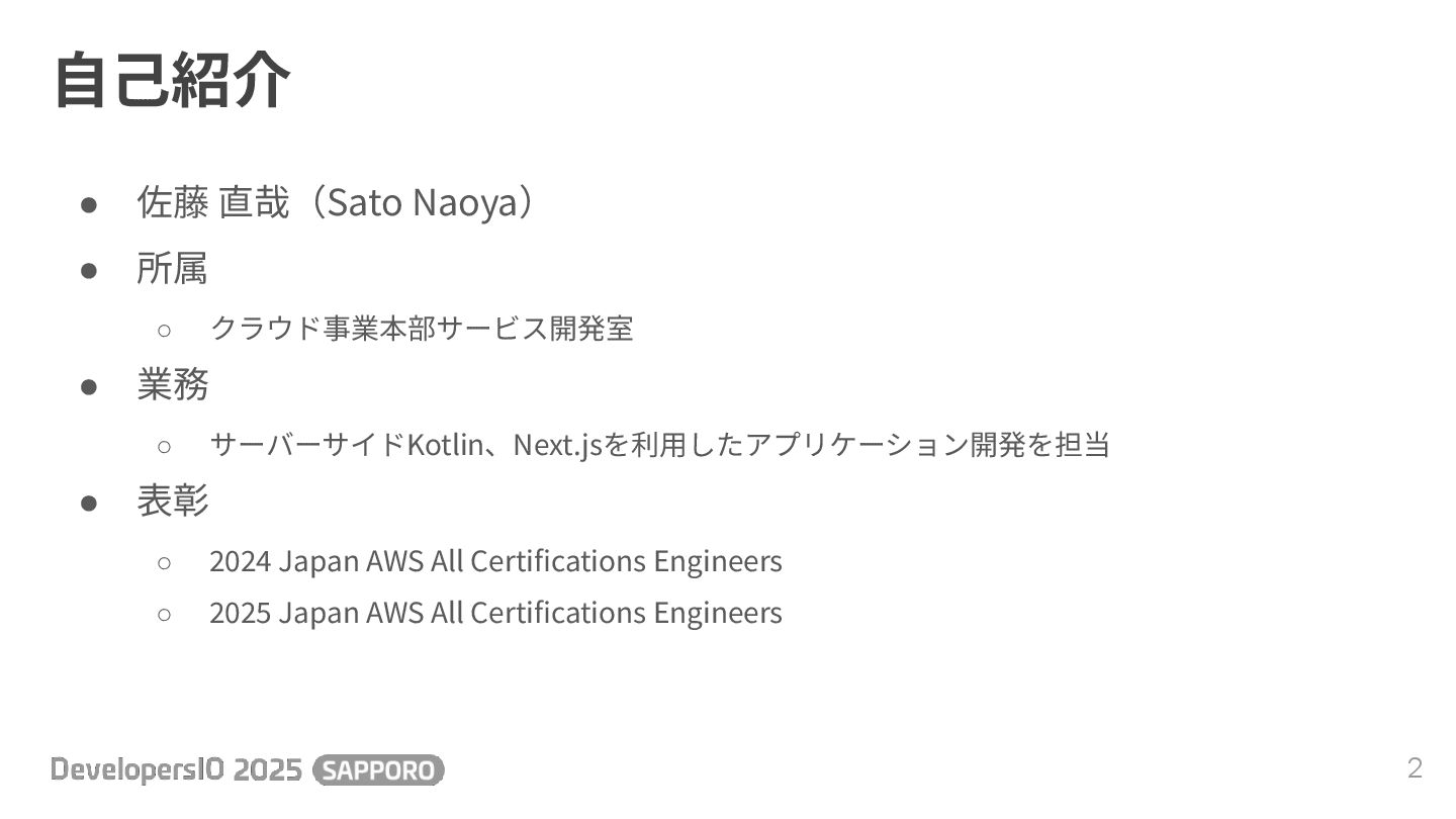 • 業務 ◦ サーバーサイドKotlin、Next.jsを利⽤したアプリケーション開発を担当 • 表彰 ◦ 2024 Japan AWS All Certifications Engineers ◦ 2025 Japan AWS All Certifications Engineers