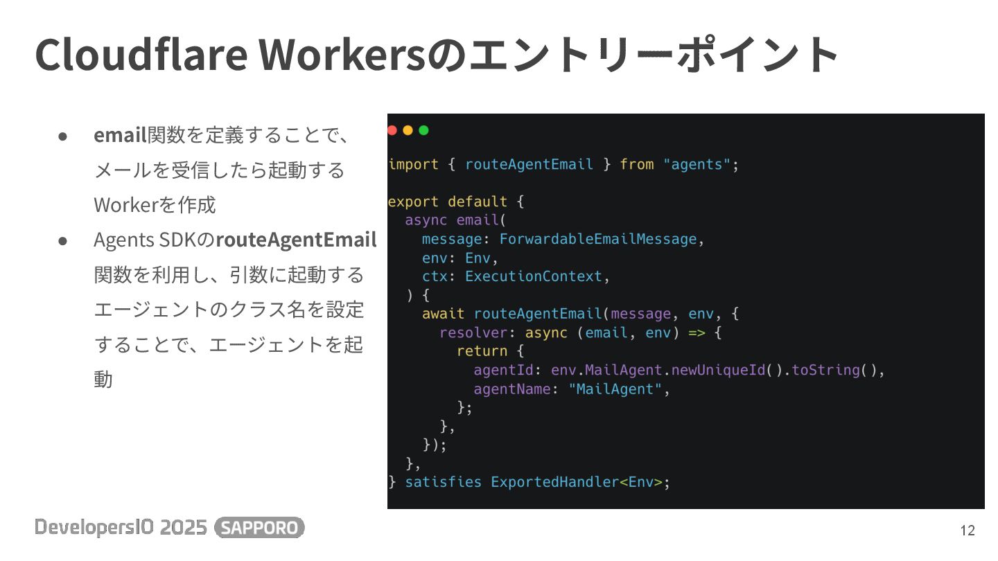 12 • email関数を定義することで、 メールを受信したら起動する Workerを作成 • Agents SDKのrouteAgentEmail 関数を利⽤し、引数に起動する エージェントのクラス名を設定