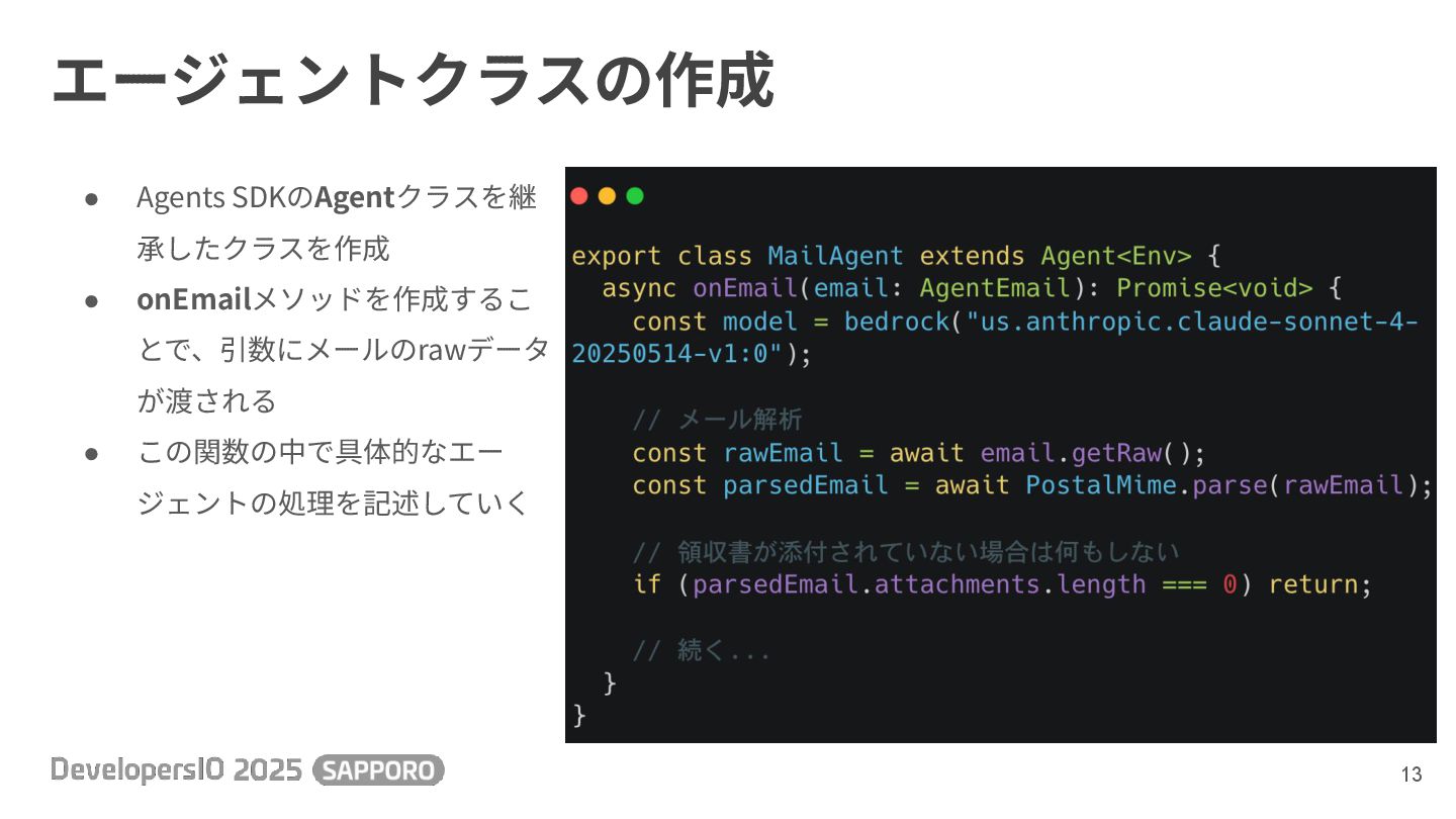 13 • Agents SDKのAgentクラスを継 承したクラスを作成 • onEmailメソッドを作成するこ とで、引数にメールのrawデータ が渡される •