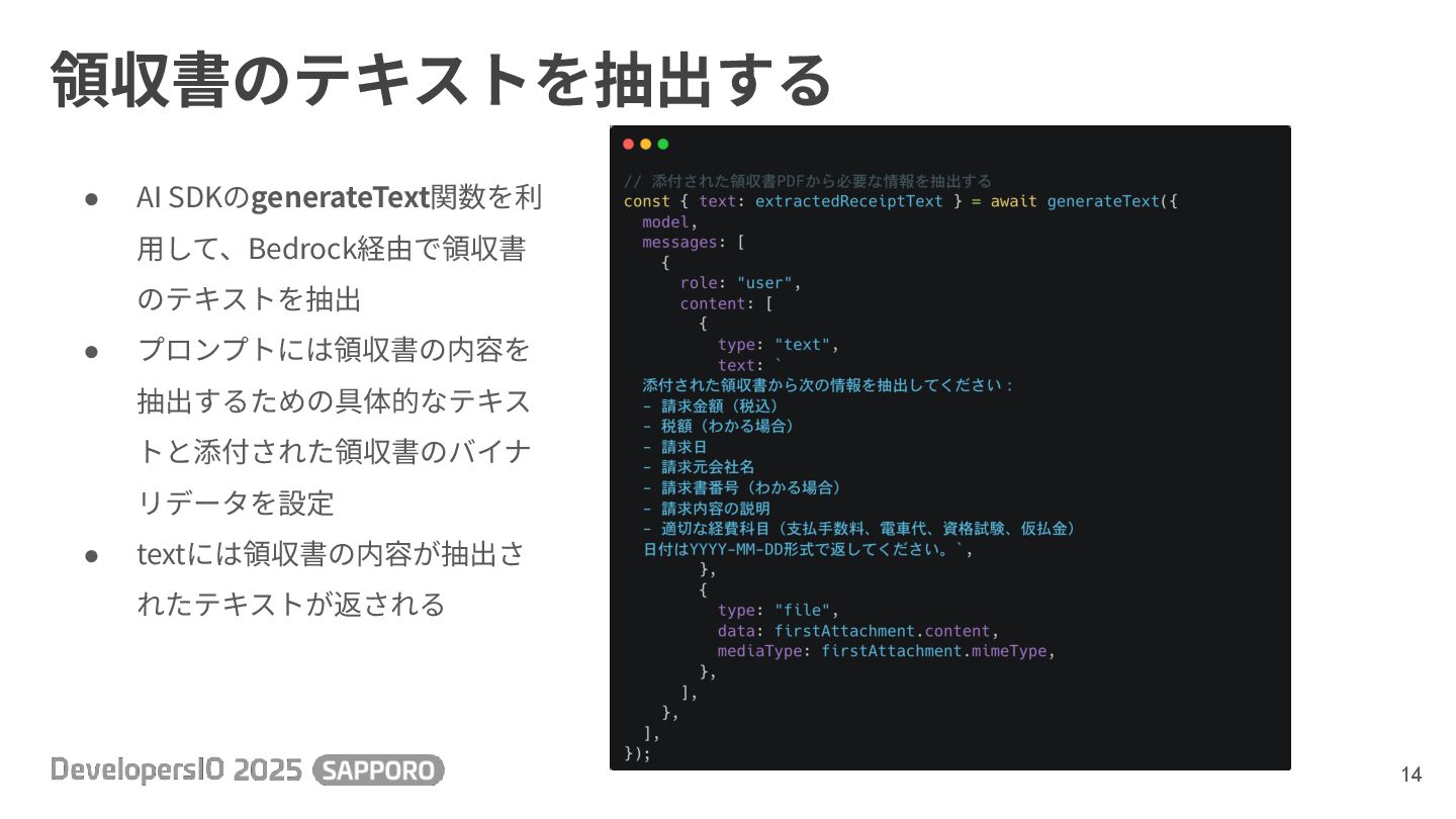 14 • AI SDKのgenerateText関数を利 ⽤して、Bedrock経由で領収書 のテキストを抽出 • プロンプトには領収書の内容を 抽出するための具体的なテキス トと添付された領収書のバイナ