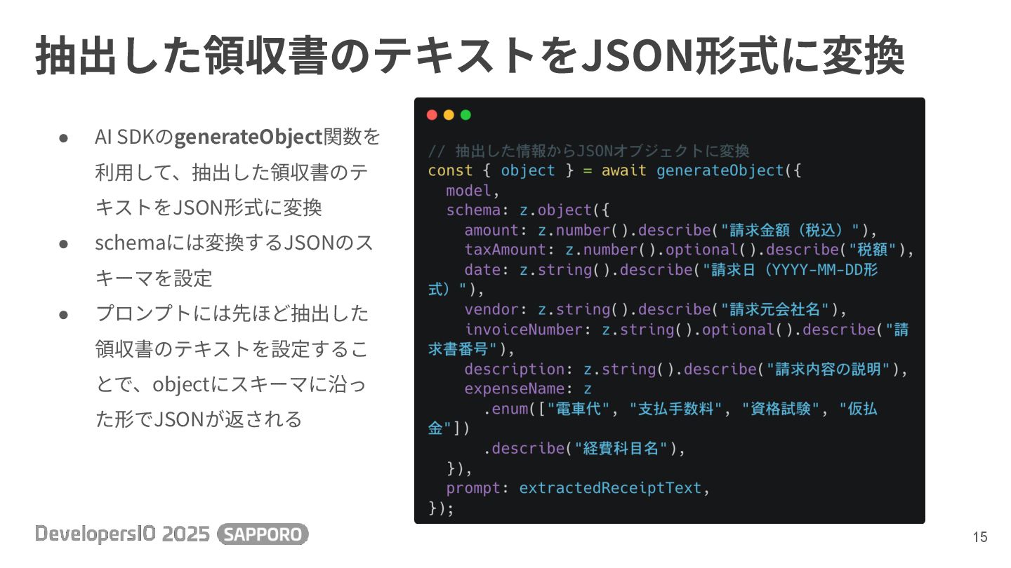 15 • AI SDKのgenerateObject関数を 利⽤して、抽出した領収書のテ キストをJSON形式に変換 • schemaには変換するJSONのス キーマを設定 •