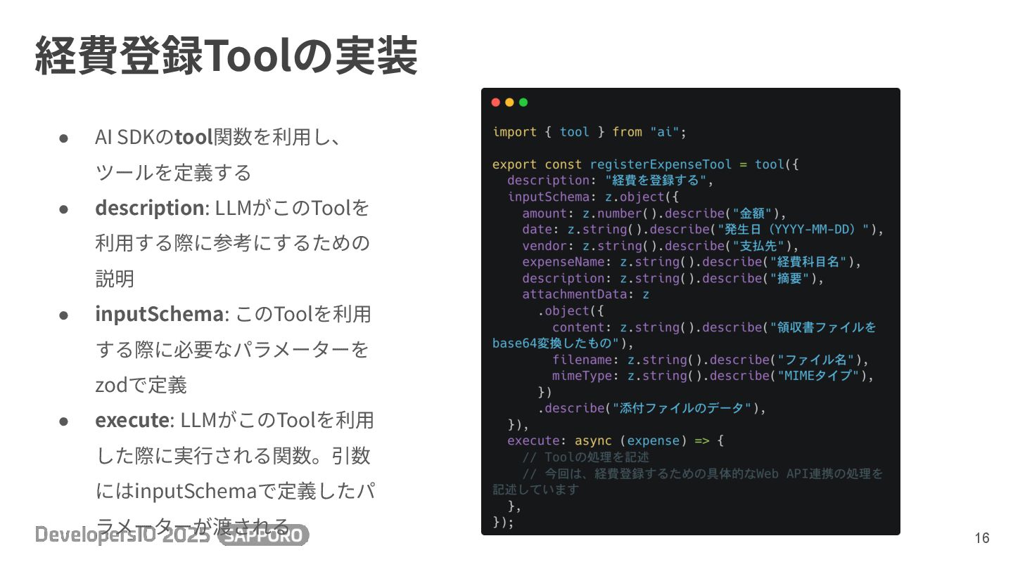 • inputSchema: このToolを利⽤ する際に必要なパラメーターを zodで定義 • execute: LLMがこのToolを利⽤ した際に実⾏される関数。引数 にはinputSchemaで定義したパ ラメーターが渡される 経費登録Toolの実装