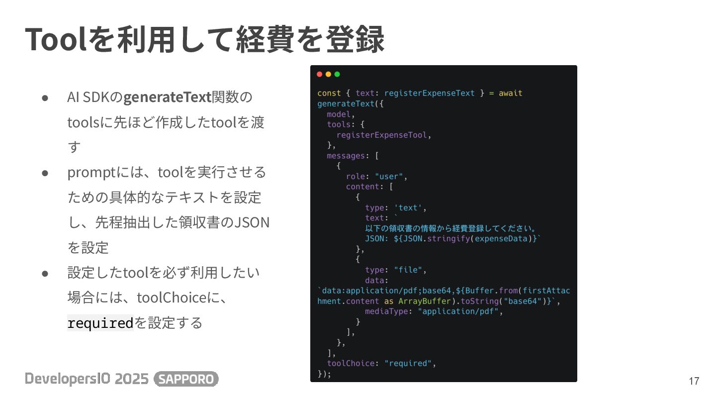 17 • AI SDKのgenerateText関数の toolsに先ほど作成したtoolを渡 す • promptには、toolを実⾏させる ための具体的なテキストを設定 し、先程抽出した領収書のJSON