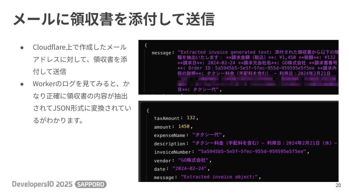 20 • Cloudflare上で作成したメール アドレスに対して、領収書を添 付して送信 • Workerのログを⾒てみると、か なり正確に領収書の内容が抽出 されてJSON形式に変換されてい るがわかります。