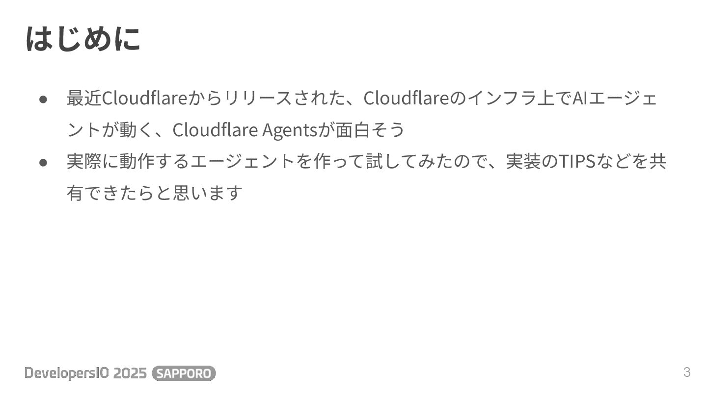 はじめに 3 • 最近Cloudflareからリリースされた、Cloudflareのインフラ上でAIエージェ ントが動く、Cloudflare Agentsが⾯⽩そう • 実際に動作するエージェントを作って試してみたので、実装のTIPSなどを共 有できたらと思います