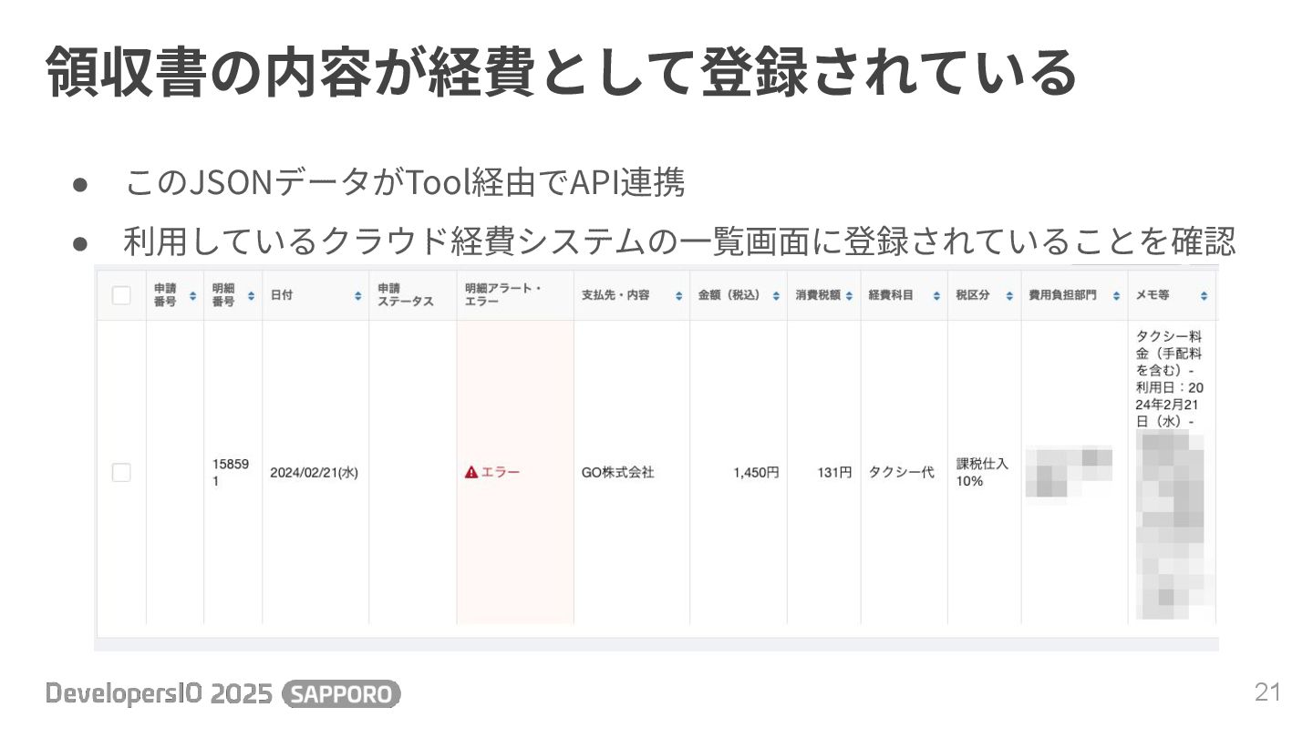 領収書の内容が経費として登録されている 21 • このJSONデータがTool経由でAPI連携 • 利⽤しているクラウド経費システムの⼀覧画⾯に登録されていることを確認