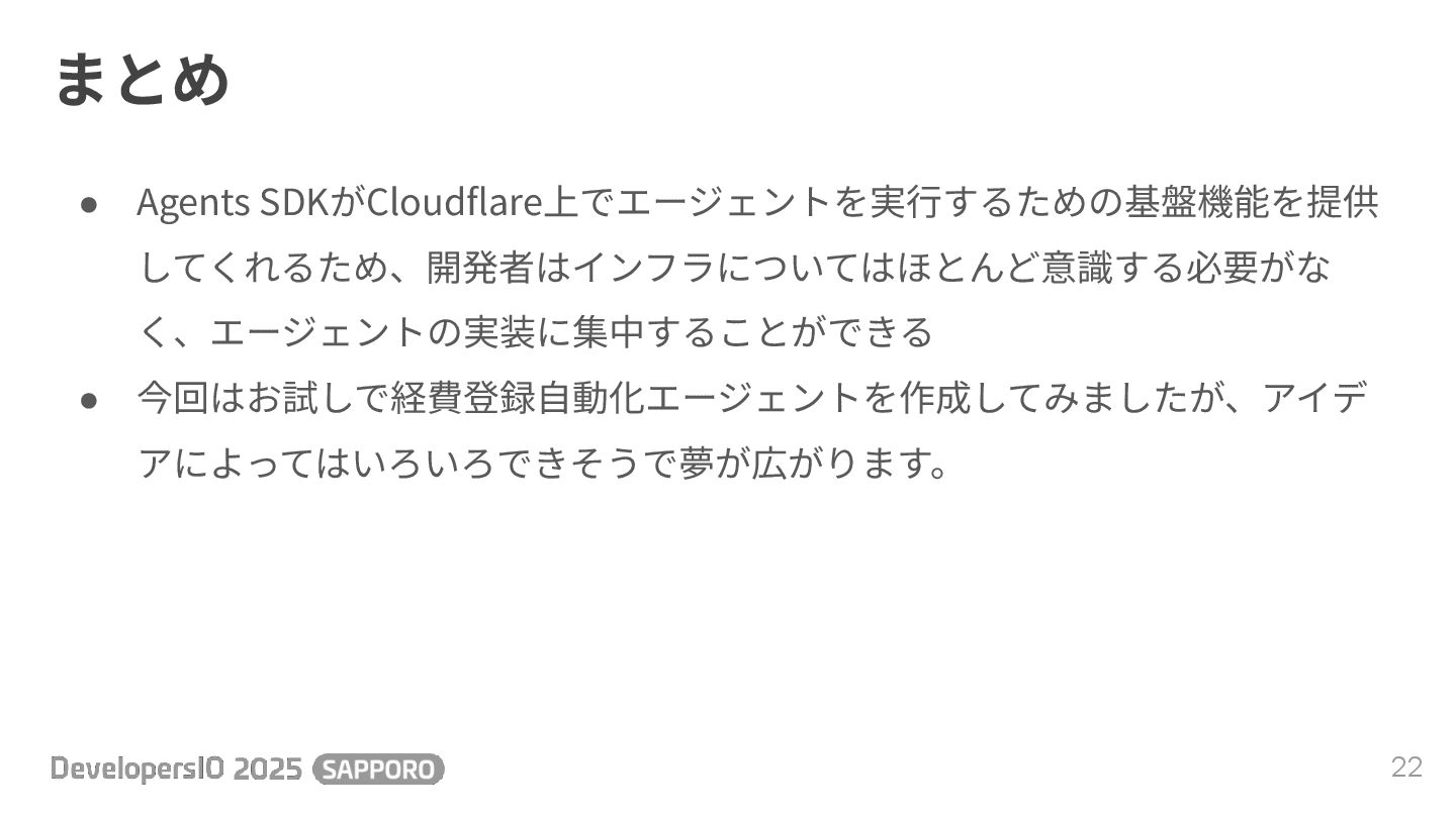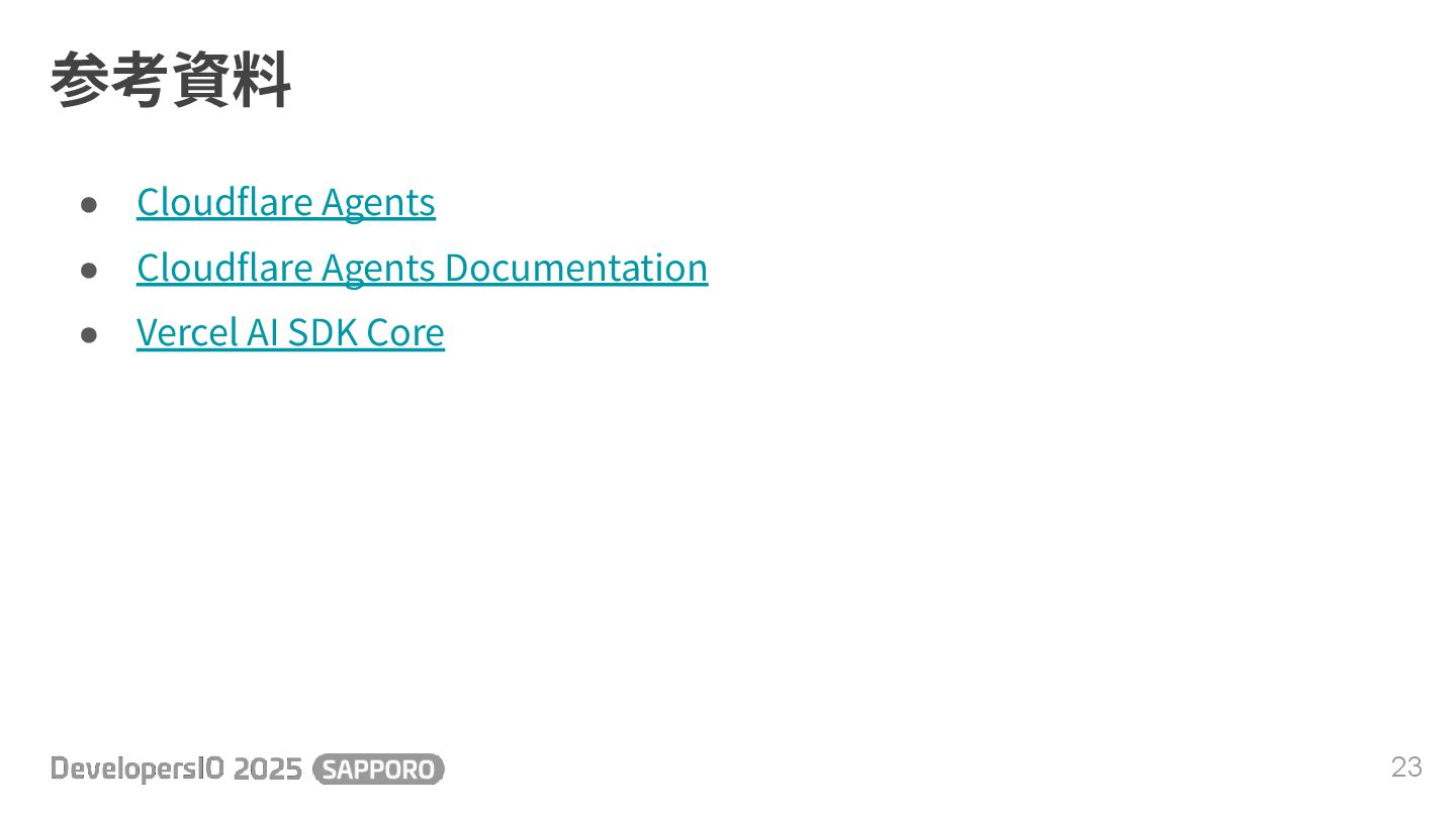 まとめ 22 • Agents SDKがCloudflare上でエージェントを実⾏するための基盤機能を提供 してくれるため、開発者はインフラについてはほとんど意識する必要がな く、エージェントの実装に集中することができる • 今回はお試しで経費登録⾃動化エージェントを作成してみましたが、アイデ アによってはいろいろできそうで夢が広がります。