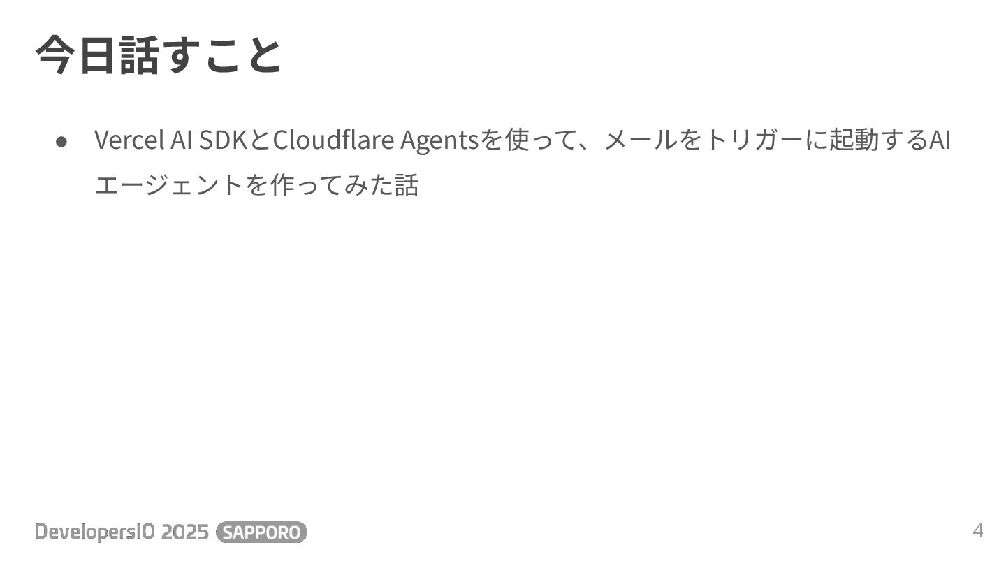 今⽇話すこと 4 • Vercel AI SDKとCloudflare Agentsを使って、メールをトリガーに起動するAI エージェントを作ってみた話