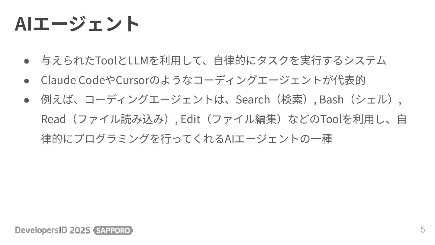 AIエージェント 5 • 与えられたToolとLLMを利⽤して、⾃律的にタスクを実⾏するシステム • Claude CodeやCursorのようなコーディングエージェントが代表的 • 例えば、コーディングエージェントは、Search(検索), Bash(シェル),
