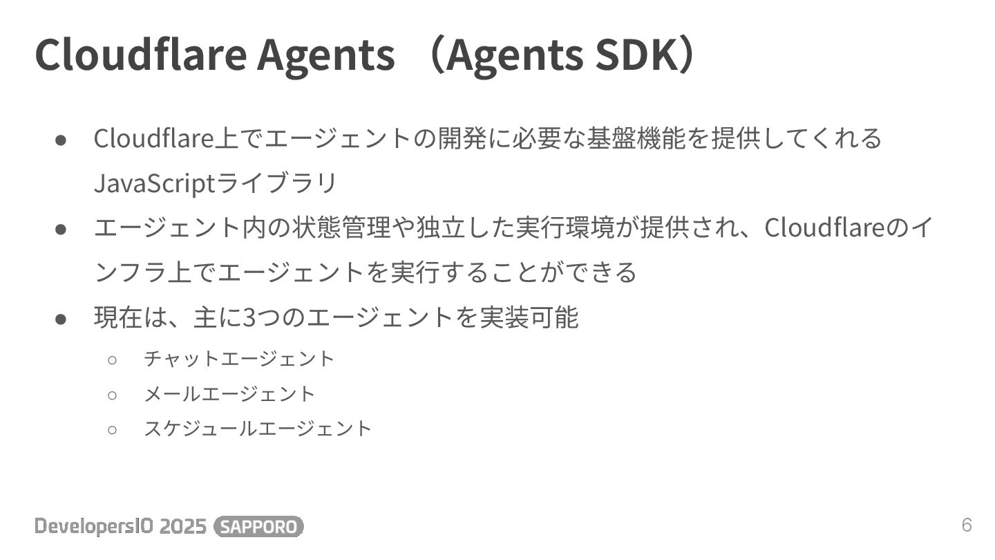 Cloudflare Agents (Agents SDK) 6 • Cloudflare上でエージェントの開発に必要な基盤機能を提供してくれる JavaScriptライブラリ • エージェント内の状態管理や独⽴した実⾏環境が提供され、Cloudflareのイ