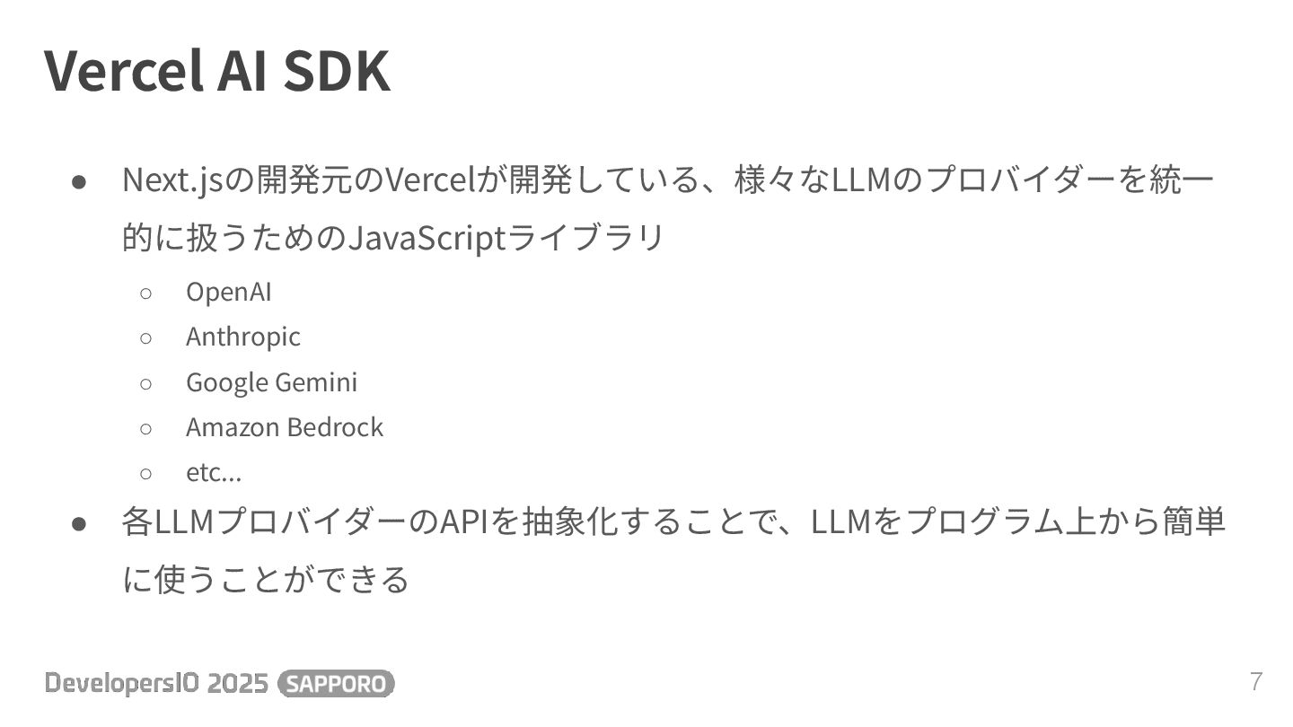 Vercel AI SDK 7 • Next.jsの開発元のVercelが開発している、様々なLLMのプロバイダーを統⼀ 的に扱うためのJavaScriptライブラリ ◦ OpenAI ◦