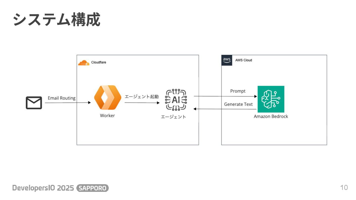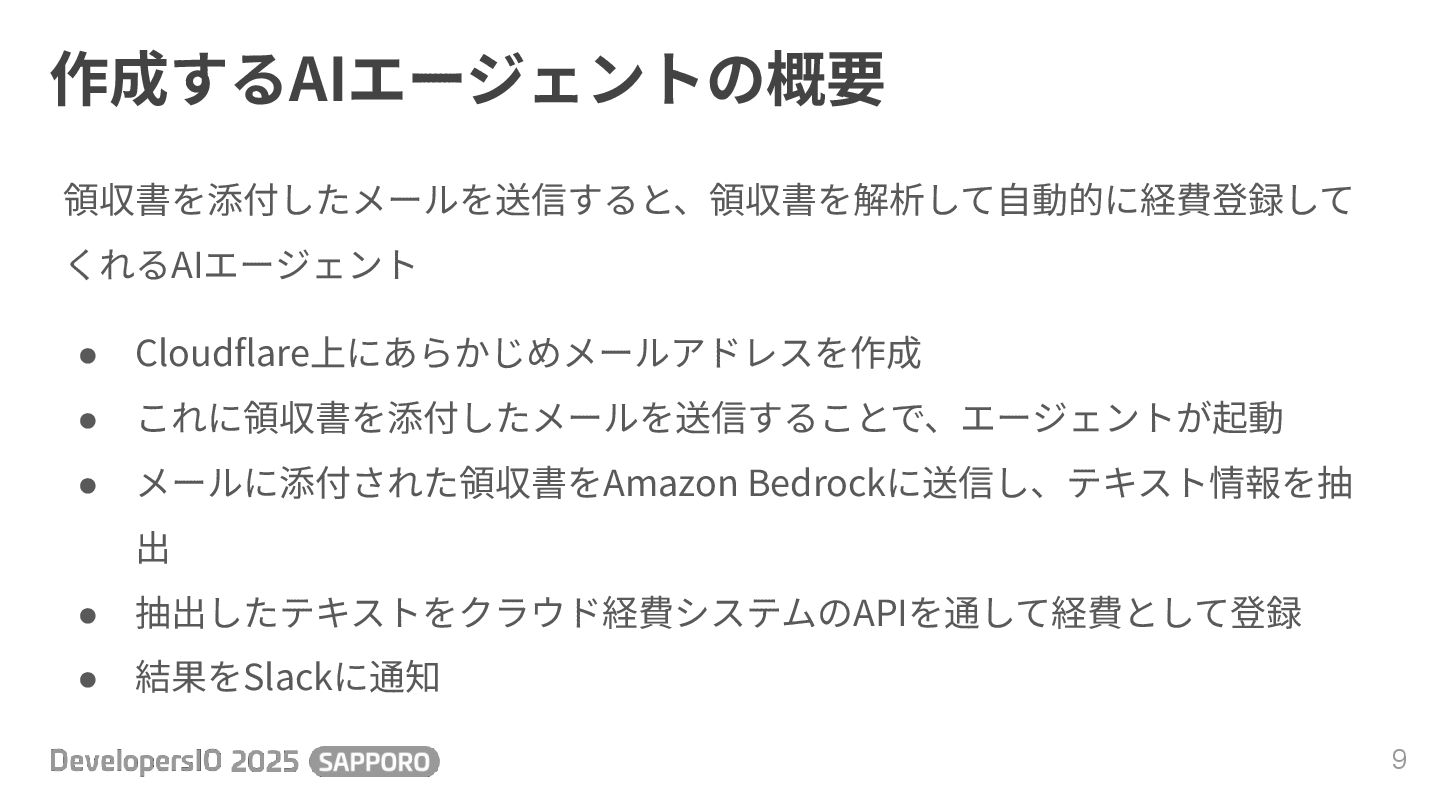 作成するAIエージェントの概要 9 領収書を添付したメールを送信すると、領収書を解析して⾃動的に経費登録して くれるAIエージェント • Cloudflare上にあらかじめメールアドレスを作成 • これに領収書を添付したメールを送信することで、エージェントが起動 • メールに添付された領収書をAmazon