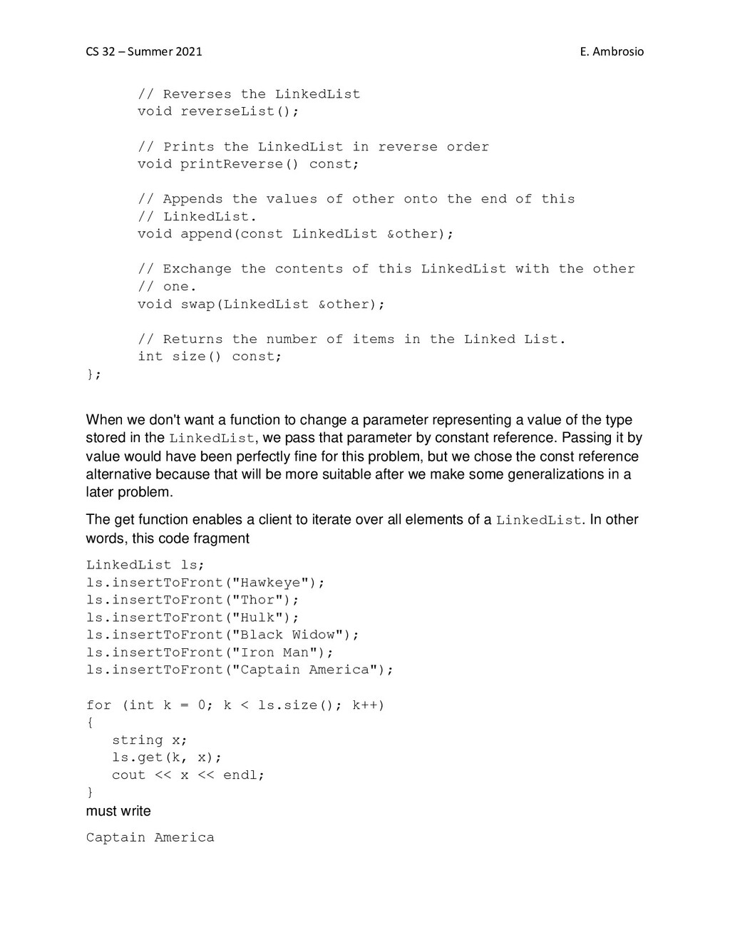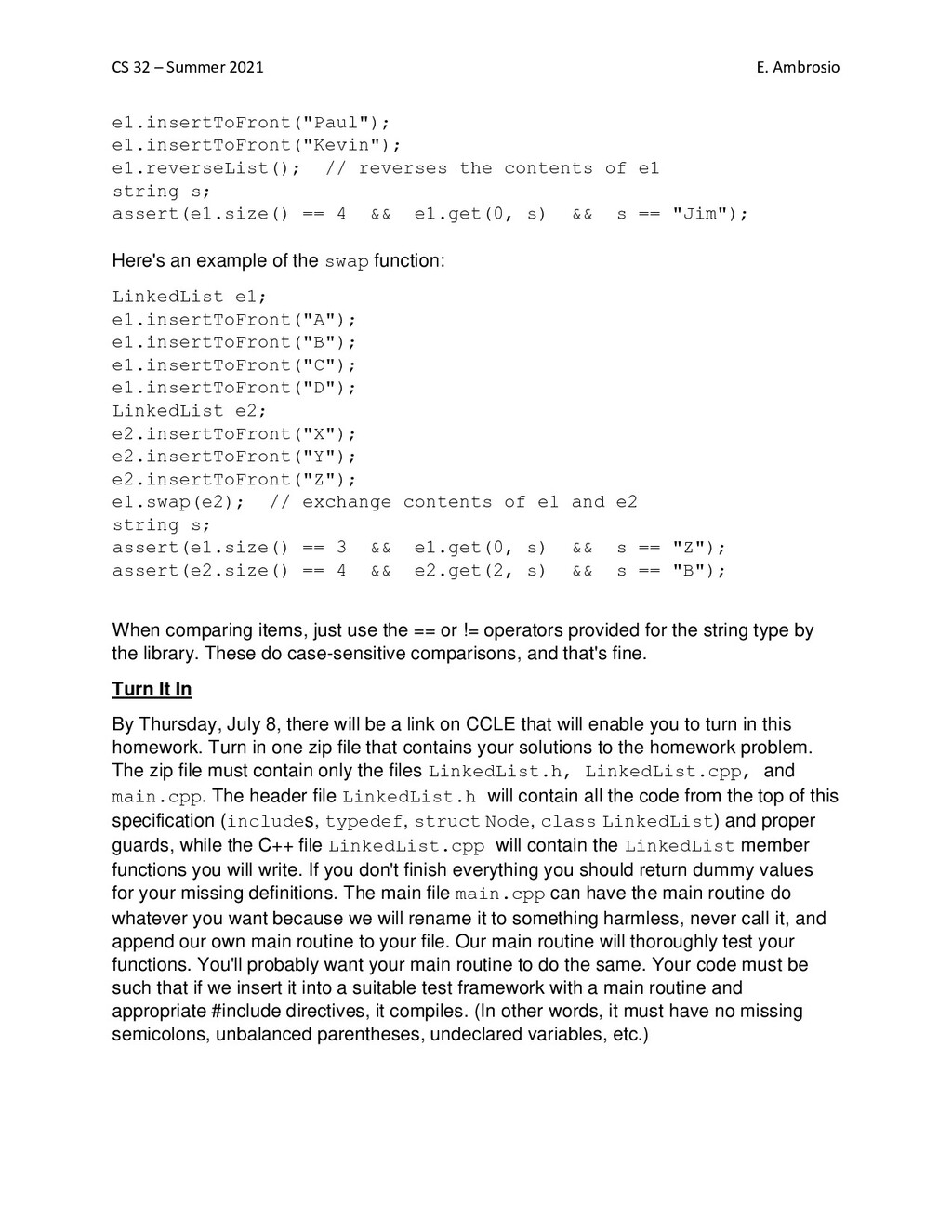 // reverses the contents of e1 string s; assert(e1.size() == 4 && e1.get(0, s) && s == "Jim"); Here's an example of the swap function: LinkedList e1; e1.insertToFront("A"); e1.insertToFront("B"); e1.insertToFront("C"); e1.insertToFront("D"); LinkedList e2; e2.insertToFront("X"); e2.insertToFront("Y"); e2.insertToFront("Z"); e1.swap(e2); // exchange contents of e1 and e2 string s; assert(e1.size() == 3 && e1.get(0, s) && s == "Z"); assert(e2.size() == 4 && e2.get(2, s) && s == "B"); When comparing items, just use the == or != operators provided for the string type by the library. These do case-sensitive comparisons, and that's fine. Turn It In By Thursday, July 8, there will be a link on CCLE that will enable you to turn in this homework. Turn in one zip file that contains your solutions to the homework problem. The zip file must contain only the files LinkedList.h, LinkedList.cpp, and main.cpp. The header file LinkedList.h will contain all the code from the top of this specification (includes, typedef, struct Node, class LinkedList) and proper guards, while the C++ file LinkedList.cpp will contain the LinkedList member functions you will write. If you don't finish everything you should return dummy values for your missing definitions. The main file main.cpp can have the main routine do whatever you want because we will rename it to something harmless, never call it, and append our own main routine to your file. Our main routine will thoroughly test your functions. You'll probably want your main routine to do the same. Your code must be such that if we insert it into a suitable test framework with a main routine and appropriate #include directives, it compiles. (In other words, it must have no missing semicolons, unbalanced parentheses, undeclared variables, etc.)