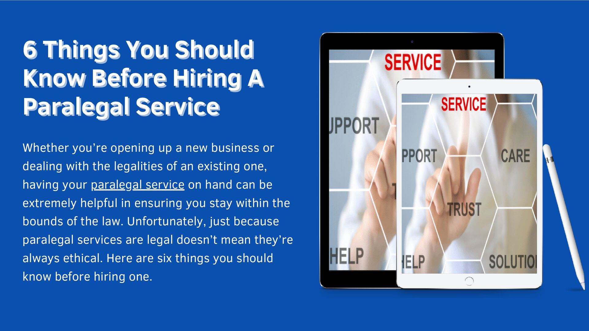 Hiring A Know Before Hiring A Paralegal Service Paralegal Service Whether you’re opening up a new business or dealing with the legalities of an existing one, having your paralegal service on hand can be extremely helpful in ensuring you stay within the bounds of the law. Unfortunately, just because paralegal services are legal doesn’t mean they’re always ethical. Here are six things you should know before hiring one.