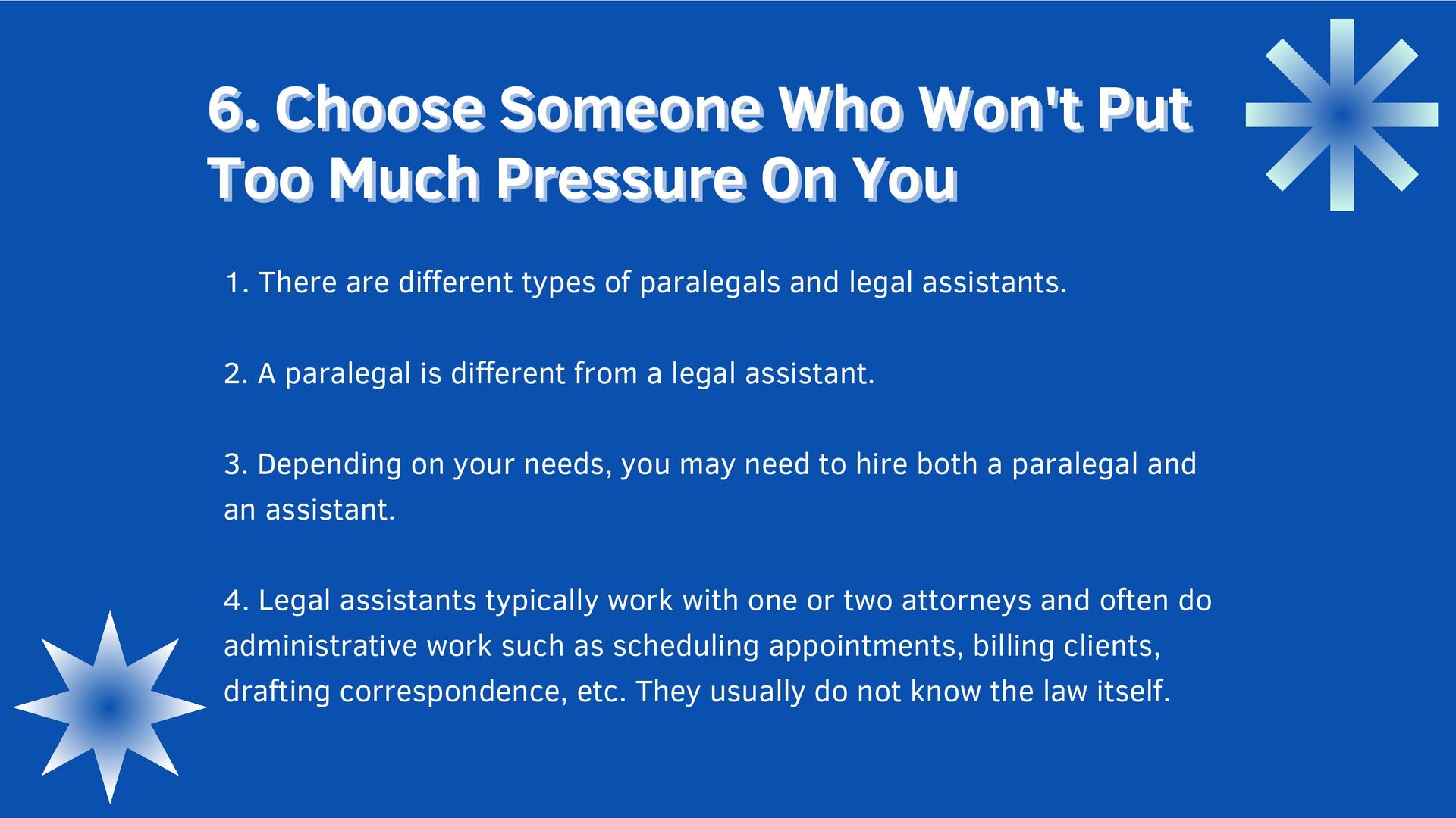 Won't Put Too Much Pressure On You Too Much Pressure On You 1. There are different types of paralegals and legal assistants. 2. A paralegal is different from a legal assistant. 3. Depending on your needs, you may need to hire both a paralegal and an assistant. 4. Legal assistants typically work with one or two attorneys and often do administrative work such as scheduling appointments, billing clients, drafting correspondence, etc. They usually do not know the law itself.