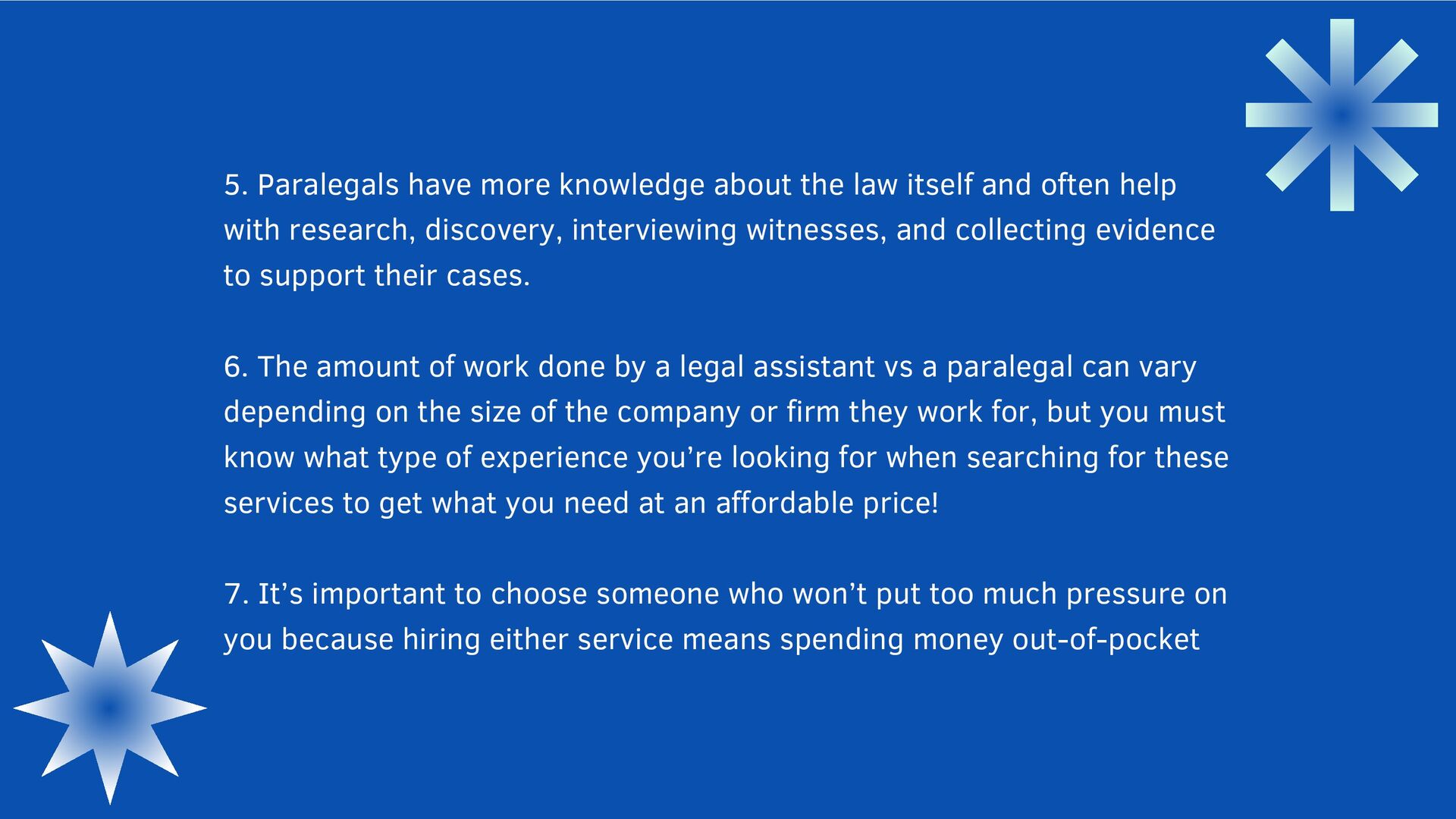 often help with research, discovery, interviewing witnesses, and collecting evidence to support their cases. 6. The amount of work done by a legal assistant vs a paralegal can vary depending on the size of the company or firm they work for, but you must know what type of experience you’re looking for when searching for these services to get what you need at an affordable price! 7. It’s important to choose someone who won’t put too much pressure on you because hiring either service means spending money out-of-pocket