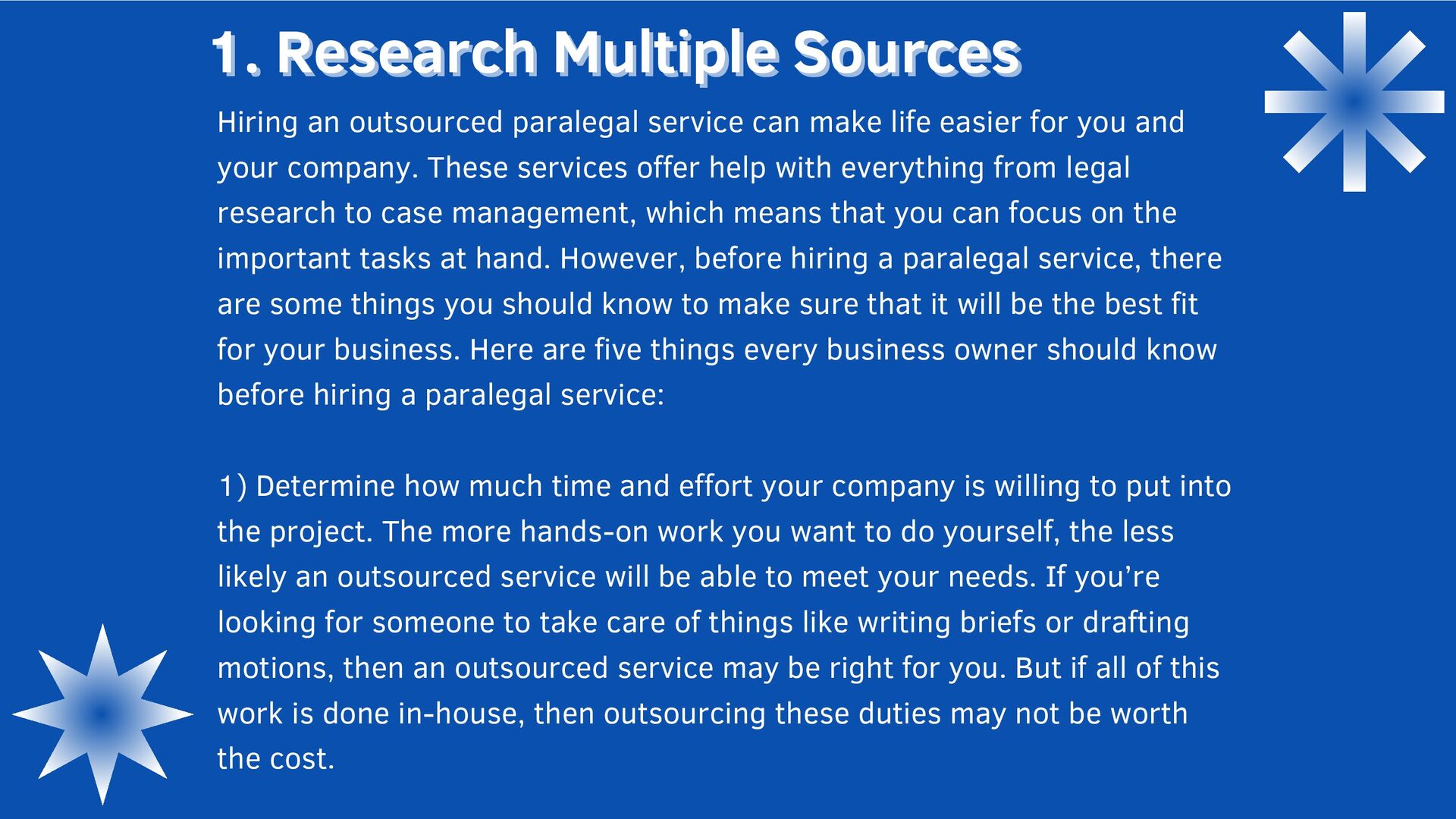 outsourced paralegal service can make life easier for you and your company. These services offer help with everything from legal research to case management, which means that you can focus on the important tasks at hand. However, before hiring a paralegal service, there are some things you should know to make sure that it will be the best fit for your business. Here are five things every business owner should know before hiring a paralegal service: 1) Determine how much time and effort your company is willing to put into the project. The more hands-on work you want to do yourself, the less likely an outsourced service will be able to meet your needs. If you’re looking for someone to take care of things like writing briefs or drafting motions, then an outsourced service may be right for you. But if all of this work is done in-house, then outsourcing these duties may not be worth the cost.