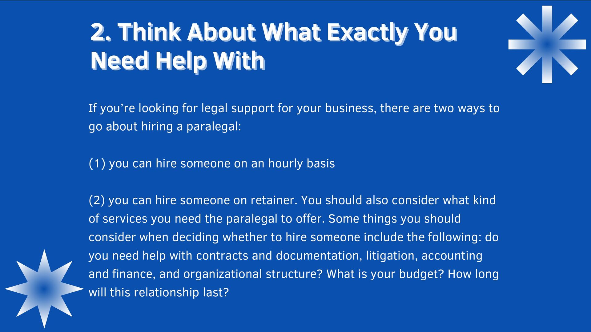 Exactly You Need Help With Need Help With If you’re looking for legal support for your business, there are two ways to go about hiring a paralegal: (1) you can hire someone on an hourly basis (2) you can hire someone on retainer. You should also consider what kind of services you need the paralegal to offer. Some things you should consider when deciding whether to hire someone include the following: do you need help with contracts and documentation, litigation, accounting and finance, and organizational structure? What is your budget? How long will this relationship last?