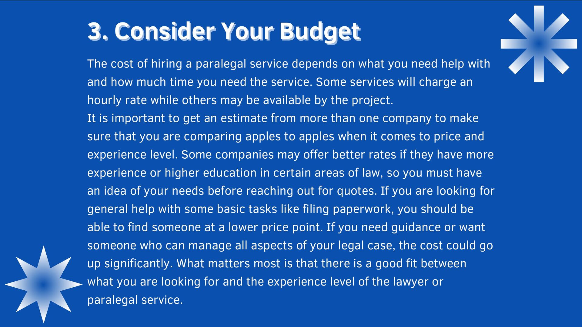 help with? Do you need assistance for ongoing or one-time projects? Will your paralegal is working on your case full-time Does your paralegal have experience in the area of law that you need help with? Do you want to hire a full-service firm, which may have more overhead and charge more per hour than an individual paralegal would charge, but offer various services like document drafting, accounting, and litigation support,
