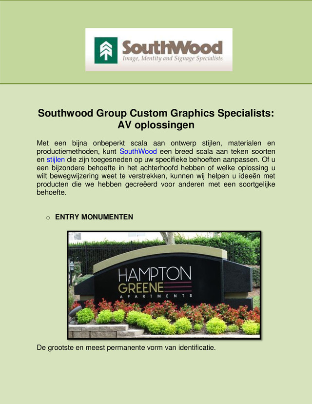 Met een bijna onbeperkt scala aan ontwerp stijlen, materialen en productiemethoden, kunt SouthWood een breed scala aan teken soorten en stijlen die zijn toegesneden op uw specifieke behoeften aanpassen. Of u een bijzondere behoefte in het achterhoofd hebben of welke oplossing u wilt bewegwijzering weet te verstrekken, kunnen wij helpen u ideeën met producten die we hebben gecreëerd voor anderen met een soortgelijke behoefte.