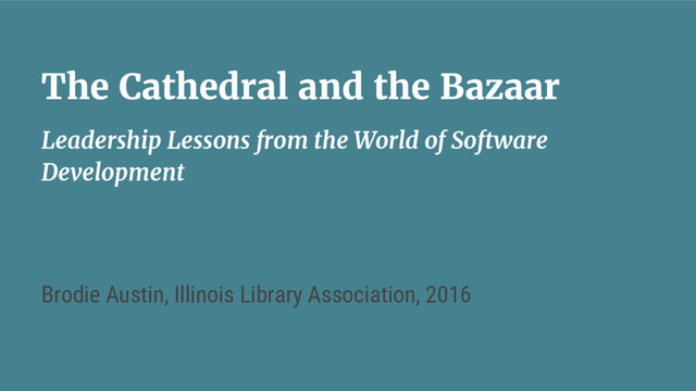 “The Cathedral and The Bazaar”, a classic essay about software development, addresses a question that is as relevant to libraries as it is to software: How do you get groups of people to make great things together? This presentation will examine the “cathedral style” (a small group who tightly controls things) and the “bazaar style” (many people working towards a common goal) in the context of how we work and lead in libraries. We will also discuss the essay’s interesting observations and lessons about managing projects, motivating people, and being an effective leader.