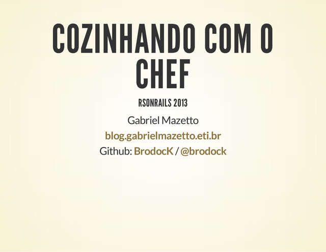 Como utilizar receitas para manter configuração de servidores, sob controle de versão, replicável, e conseguir escalar para milhões de máquinas em (quase) poucos segundos. Bonus: Como manter as máquinas de desenvolvimento com as aplicações e blibiotecas essenciais sempre instaladas e atualizadas.