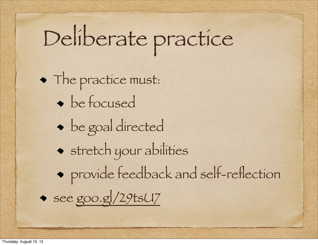 Deliberate practice The practice must: be focused be goal directed