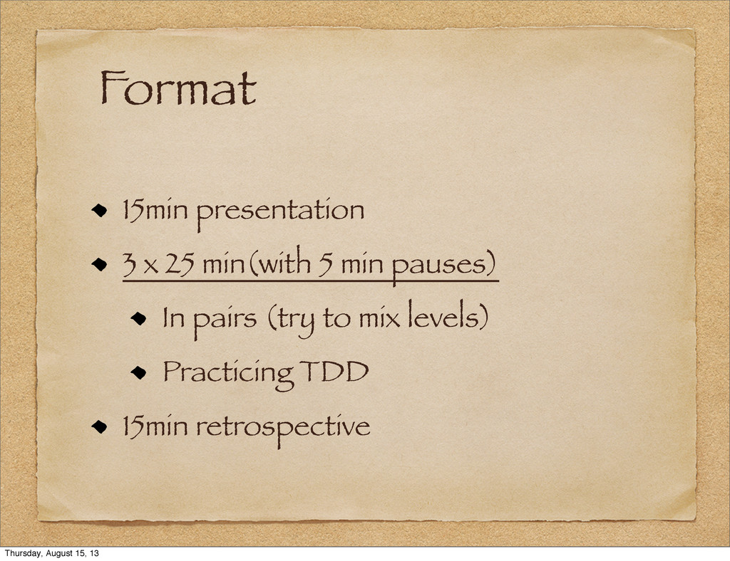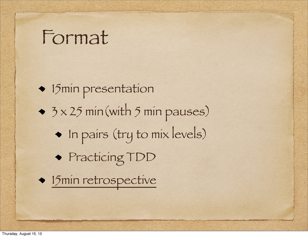 In pairs (try to mix levels) Practicing TDD 15min retrospective Thursday, August 15, 13