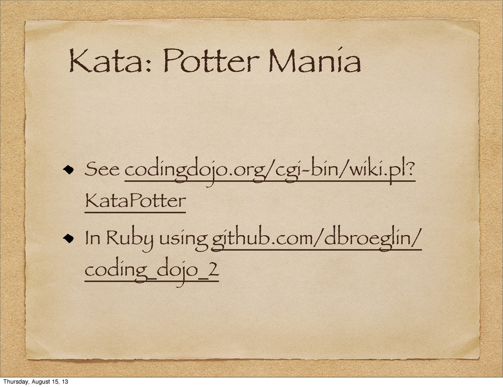 Kata: Potter Mania See codingdojo.org/cgi-bin/wiki.pl? KataPotter In Ruby using github.com/dbroeglin/
