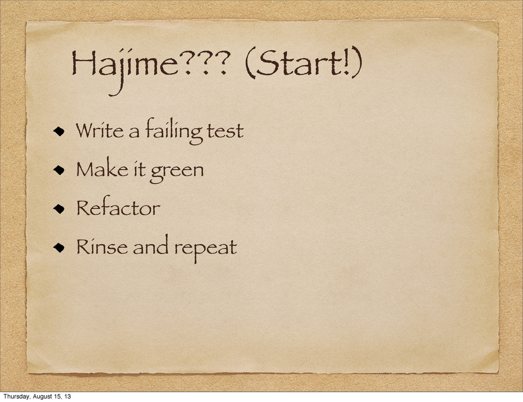 Hajime??? (Start!) Write a failing test Make it green Refactor