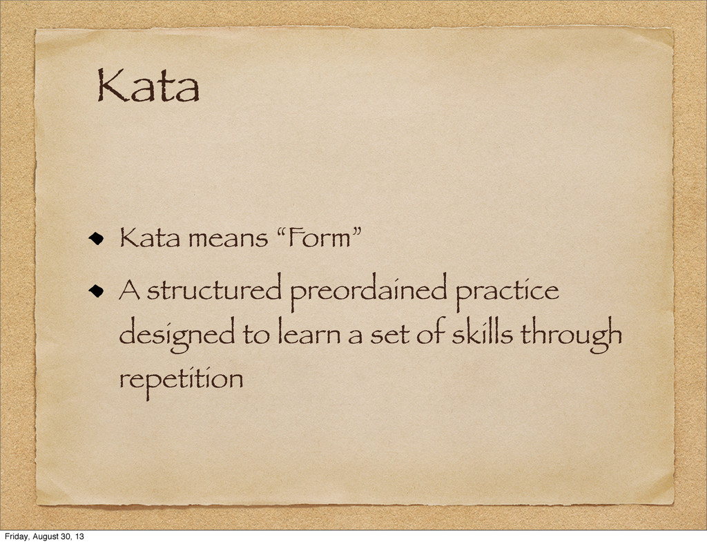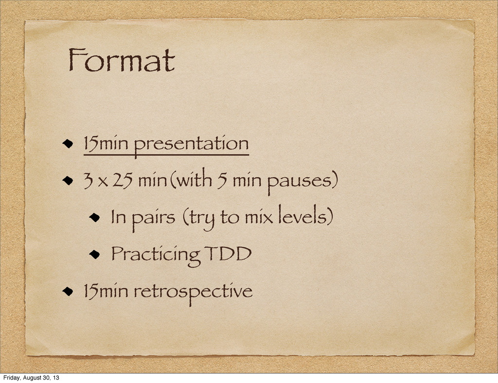In pairs (try to mix levels) Practicing TDD 15min retrospective Friday, August 30, 13