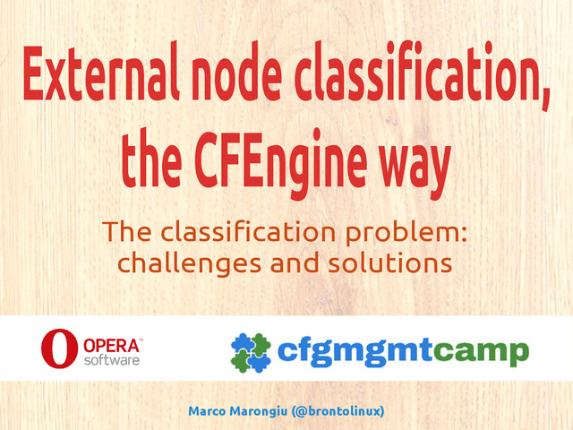 I’ll try to give you an idea of why classification in configuration management is critical, why it is difficult, and how you can make it sane. It’s the same seminar as FOSDEM; however, I’ll be able to show some examples of what makes classification difficult when you try to do it only “internally” with your CM tool of choice, and I’ll be able to show analogies and differences between Puppet and CFEngine when it comes to external node classification.