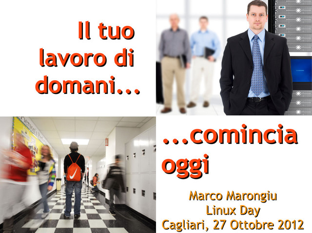 I held this presentation (in Italian) two times at the Italian Linux Day event in Cagliari (Sardinia, Italy) in 2012 and 2013. The seminar targets young people that are about to finish their course of studies and prepare for the big challenge of finding a job.