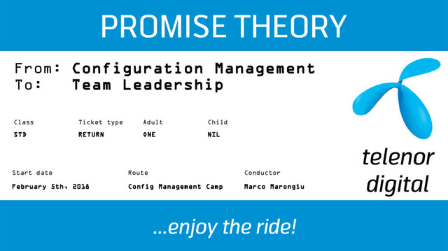 How I applied Promise Theory to managing a loose team of people to most of whom I don’t have a line of command. PT was born in 2004 as Mark Burgess was looking for a model to describe CFEngine 3 but it soon proved able to model any complex system, and I had used CFEngine a lot when I became the Head of IT in Telenor Digital. With a lot of both operational and managerial tasks and an initial team size of one and then two, the challenge was big and borrowing help from other functions in the company was a necessity. A traditional management style was not going to work, so I decided to shape my own management style by using PT. This is the report of the first year.
