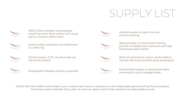 removing all visible debris and contaminants. This is usually not enough for most health officials inspecting your workstation. Disinfecting is the process of killing all bacteria, fungus, viruses off of surfaces that may have come in contact with your client's skin. When you properly disinfect your tools and surfaces, it's highly unlikely that you will be transmitting anything infectious to the next client. Sterilizing kills any trace of microscopic life on your surfaces. Chemical sterilants are usually too harsh and hazardous for a salon environment, but you could potentially use an autoclave to steam sterilize your tools. The easiest method is disinfecting, because you could sanitize your tools of visible debris (a tweezed hair, some dead skin) by scrubbing with soap and water, and soaking in a disifectant solution to kill remaining bacteria (like CS20, a 20 minute soak). Consult your health authorities to see what their mandate is. Once you've determined the required disinfection protocols for your municipality, add those supplies to your list.