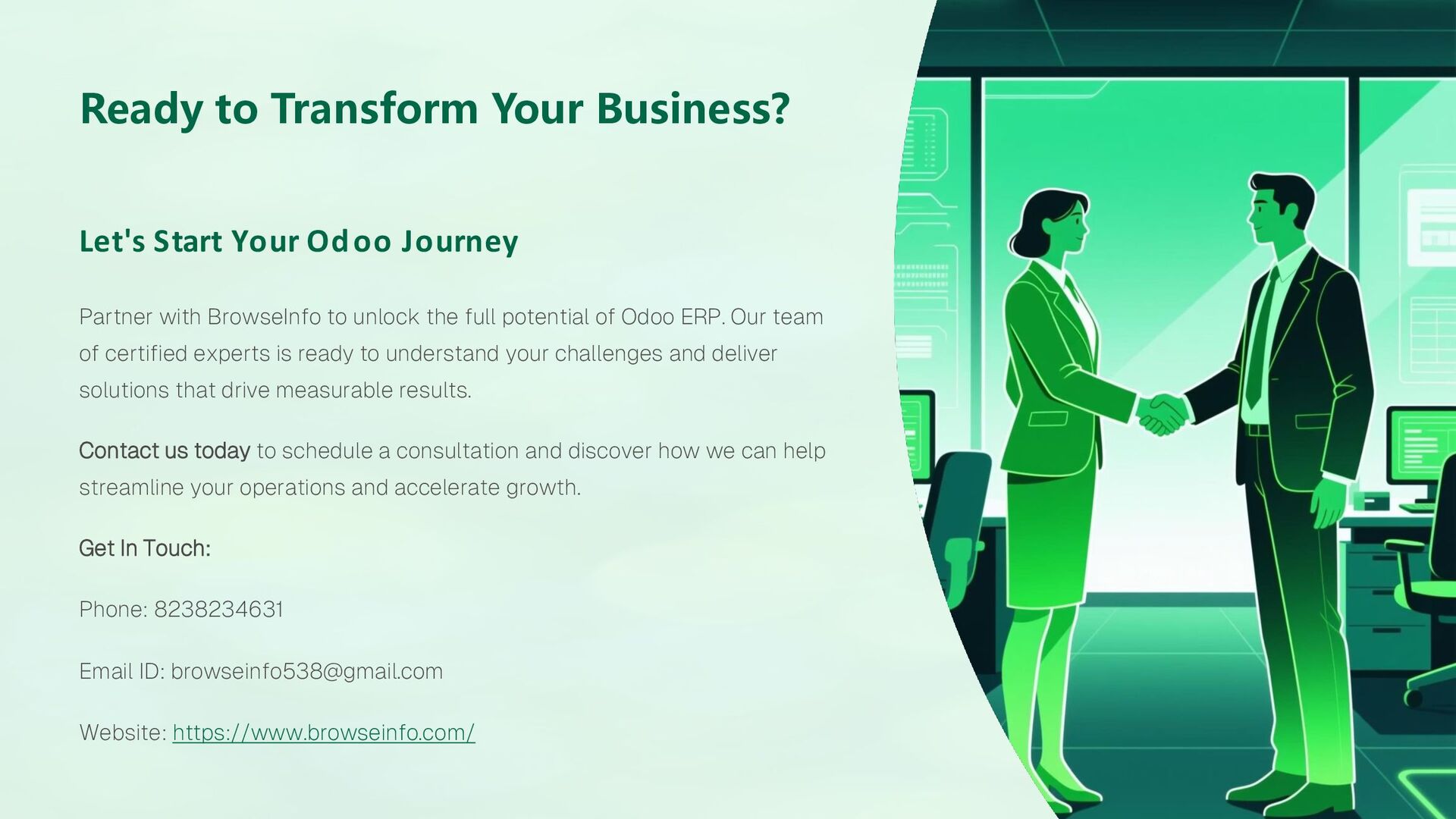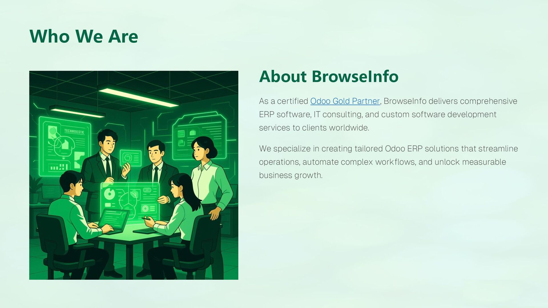 "BrowseInfo is a global Odoo services provider and Odoo ERP development company recognized for its expertise in Odoo customization, implementation, and business automation. As an Odoo Gold Partner, BrowseInfo delivers innovative ERP software solutions that empower organizations to enhance performance and scale seamlessly.
